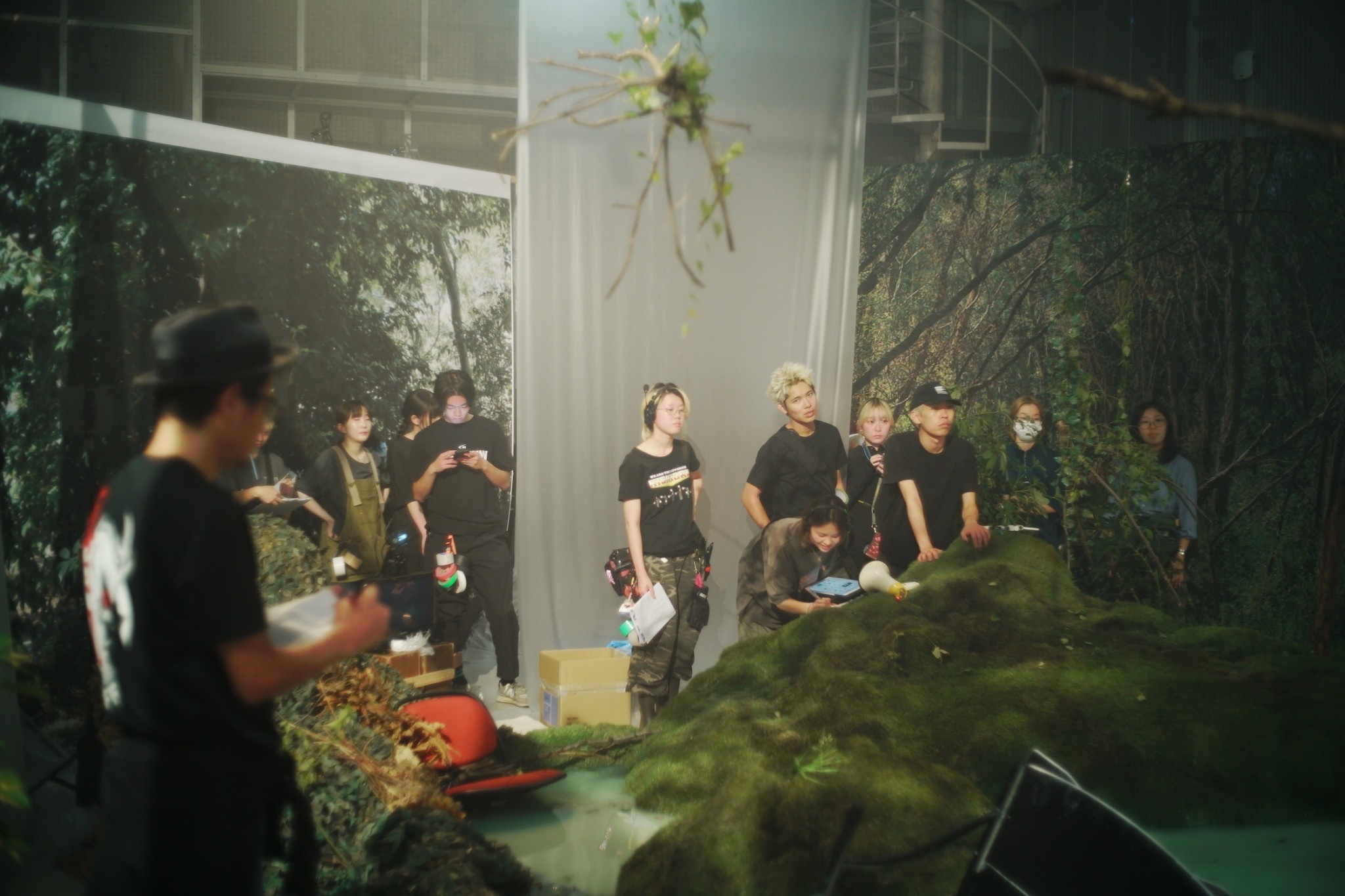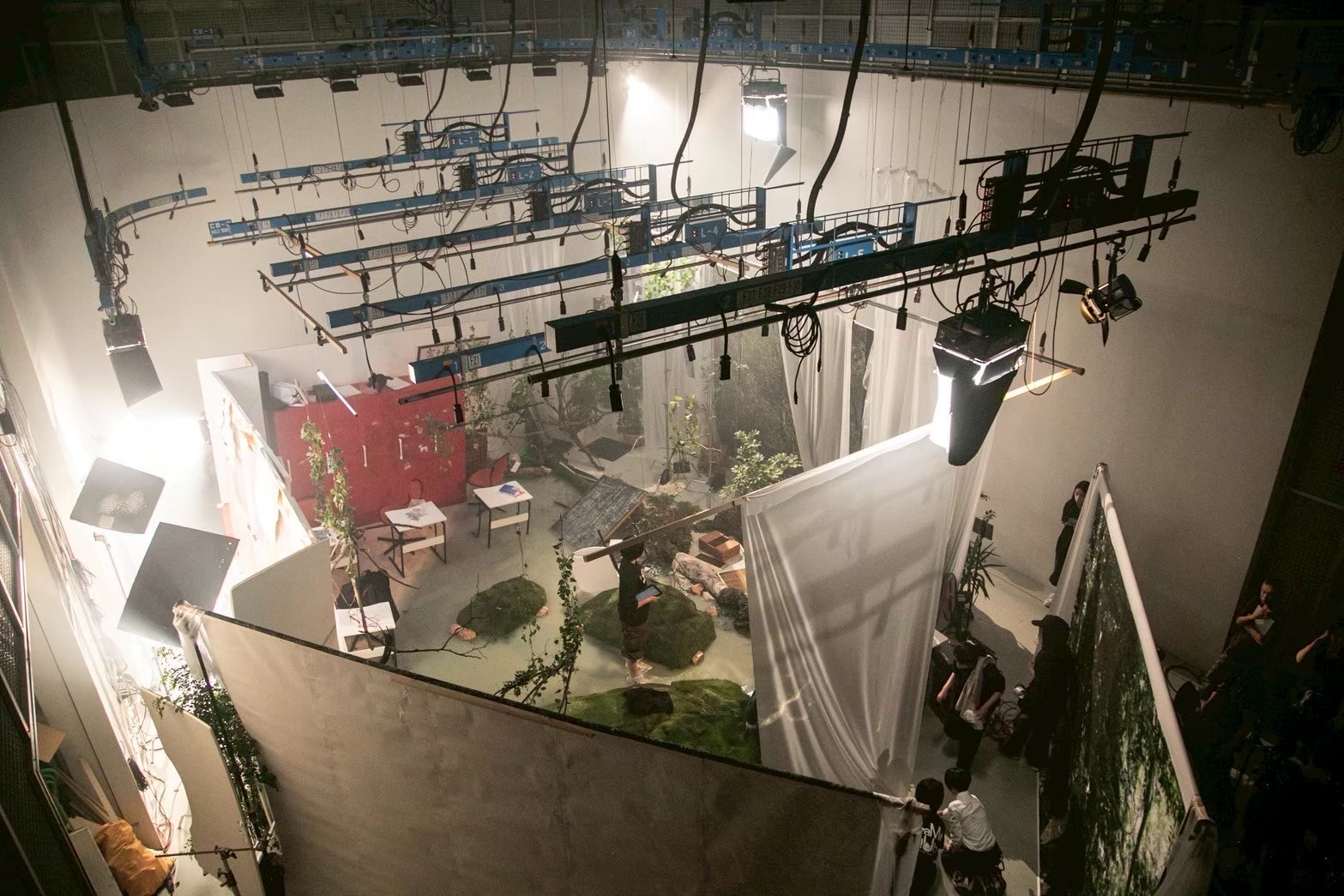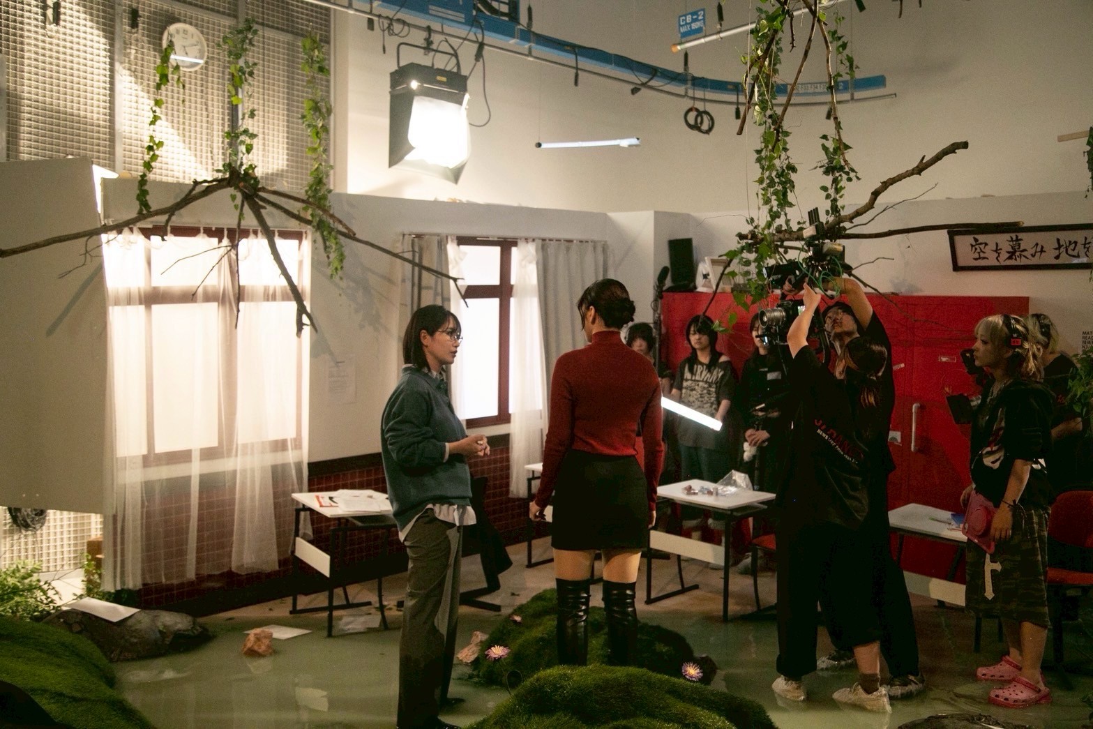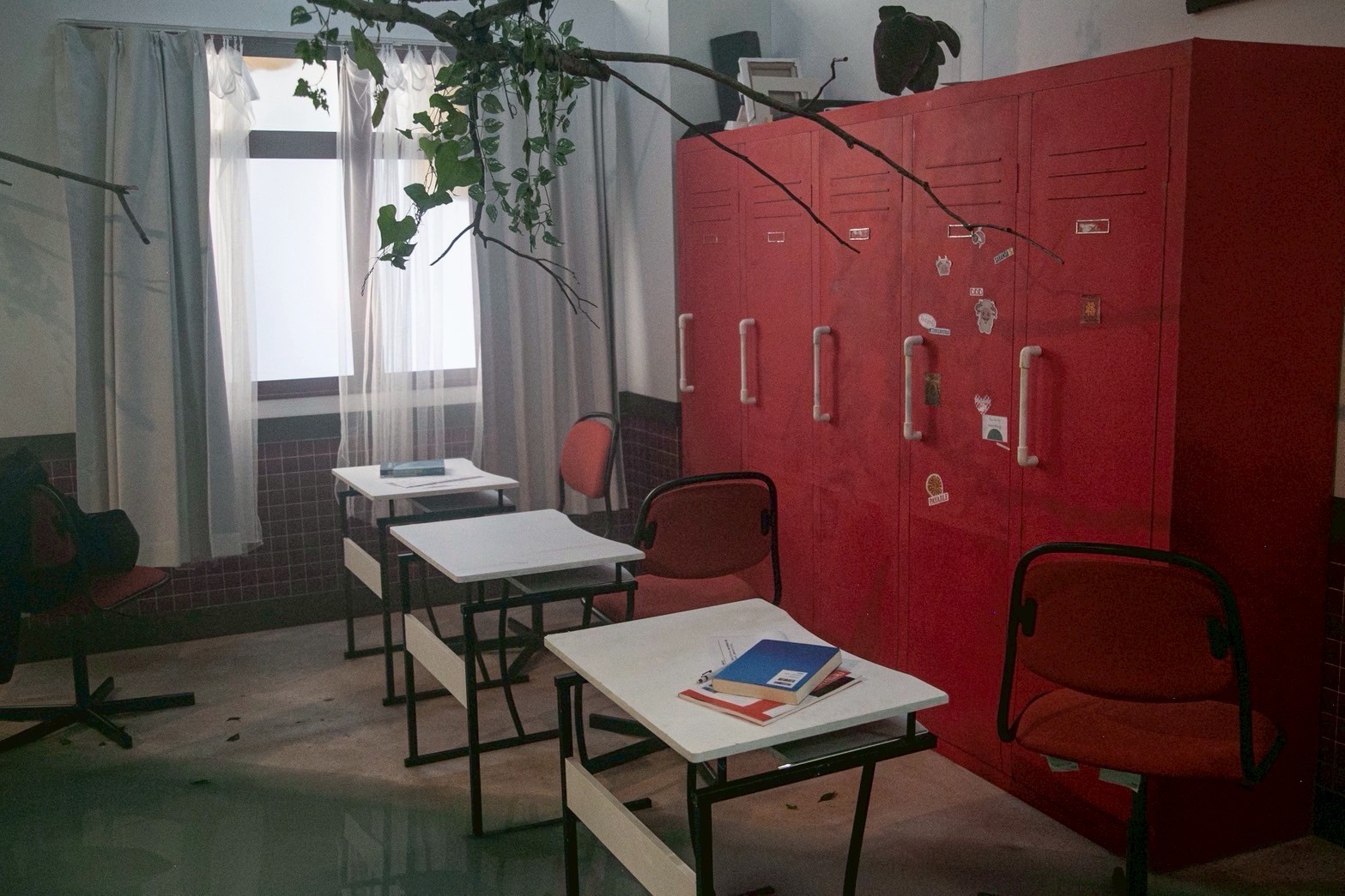 As a production designer, I was responsible for designing and constructing of the main set. This is the space where Izuhara and Himari arrive to confront their past memories. This space is like a simulated past, based on their memories from ten years ago, during their high school days. Two key locations, “The classroom” and “The hill behind the school,” are merged into a single, ambiguous environment. This set can be divided into two areas: the classroom and the back hill. The room with red lockers is the classroom. Facing it is the back hill, covered with greenery. To create a more imaginary and blurred atmosphere, the floor is filled with blue-green water. The classroom is built at an angle, leaning toward the water’s surface as if it were slowly sinking. Small hills scattered across the water appear like isolated islands.