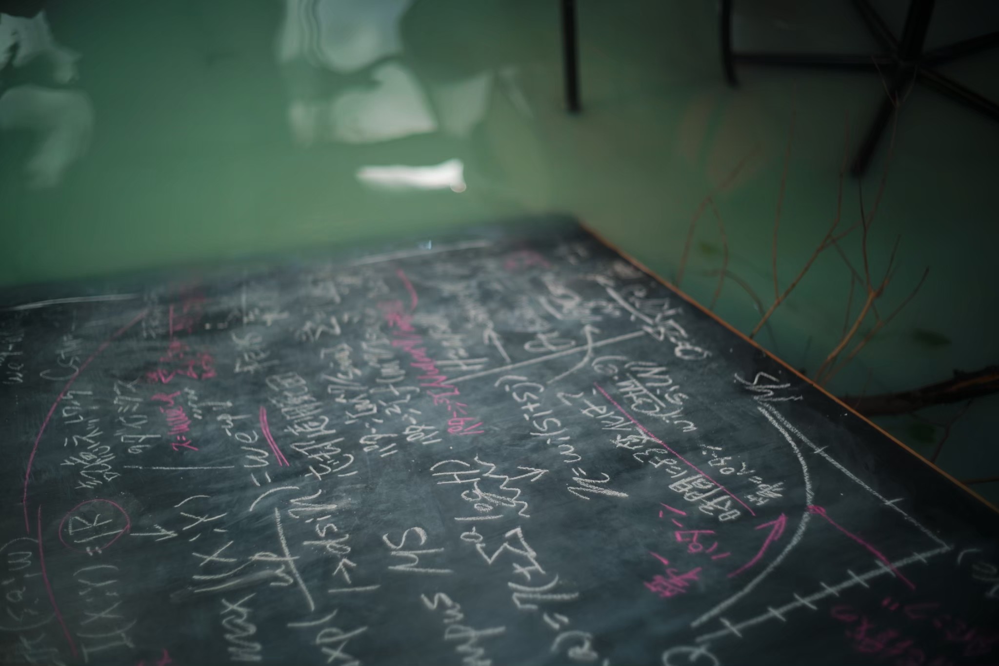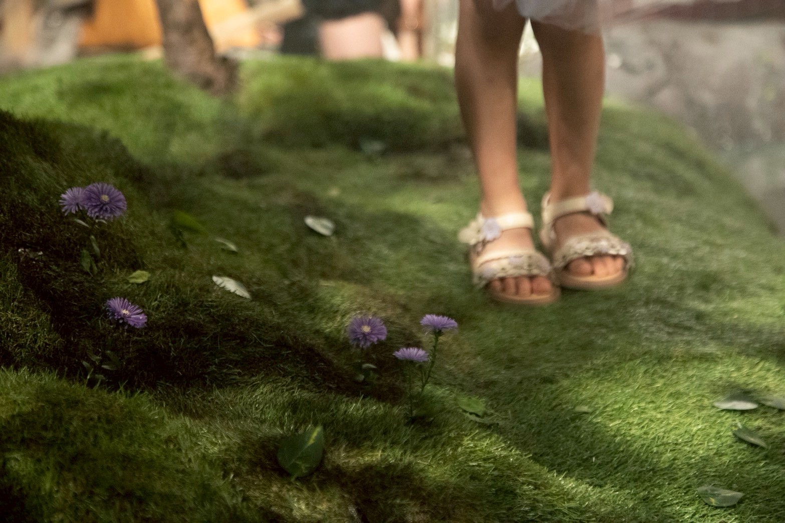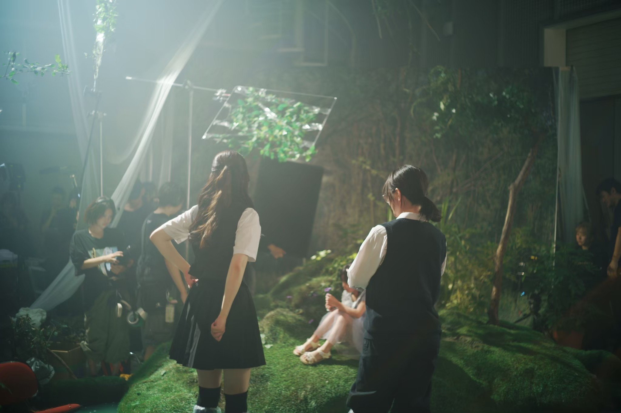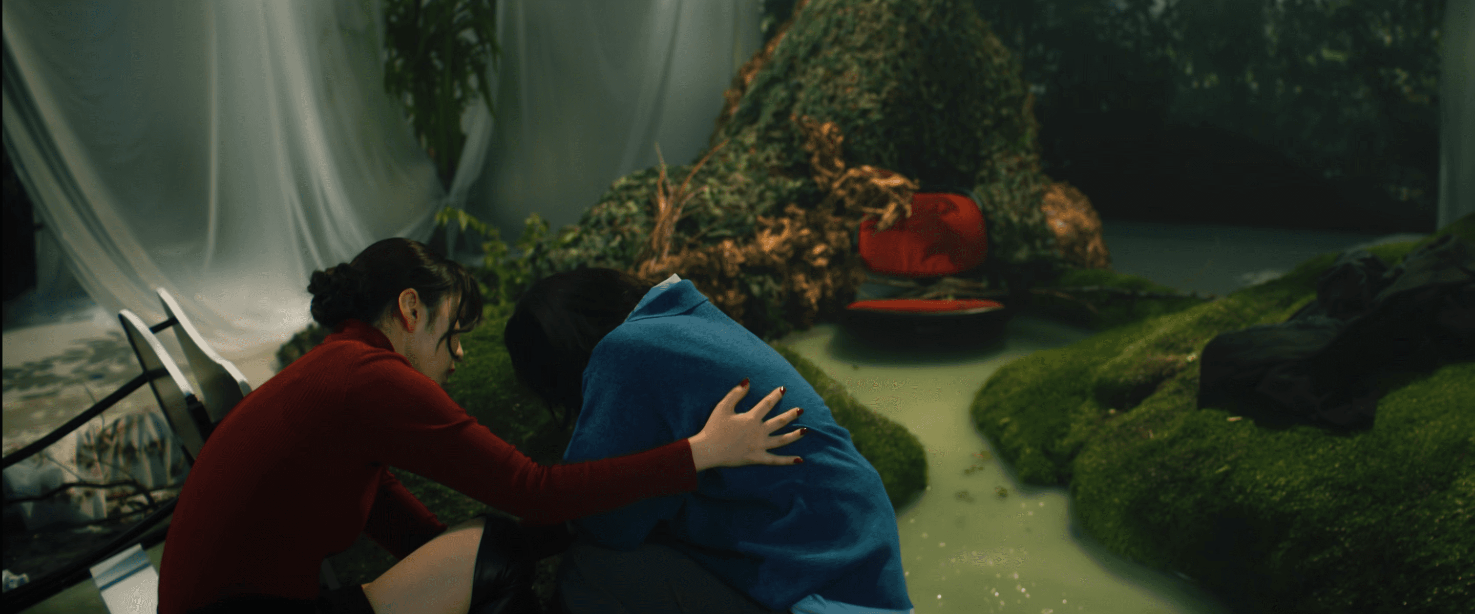 As a production designer, I was responsible for designing and constructing of the main set. This is the space where Izuhara and Himari arrive to confront their past memories. This space is like a simulated past, based on their memories from ten years ago, during their high school days. Two key locations, “The classroom” and “The hill behind the school,” are merged into a single, ambiguous environment. This set can be divided into two areas: the classroom and the back hill. The room with red lockers is the classroom. Facing it is the back hill, covered with greenery. To create a more imaginary and blurred atmosphere, the floor is filled with blue-green water. The classroom is built at an angle, leaning toward the water’s surface as if it were slowly sinking. Small hills scattered across the water appear like isolated islands.